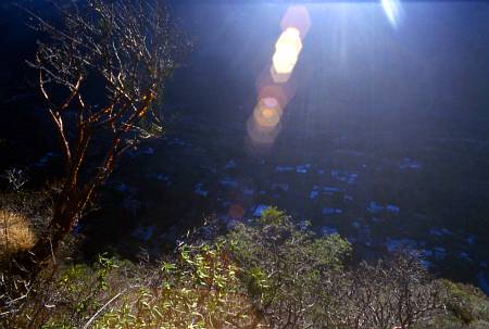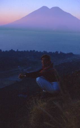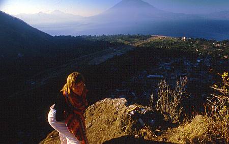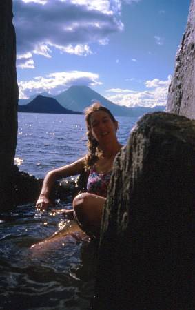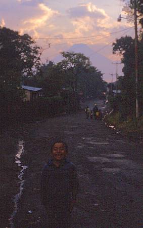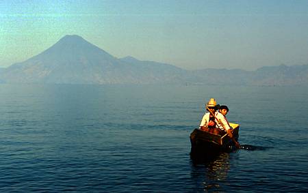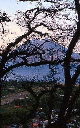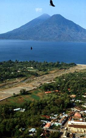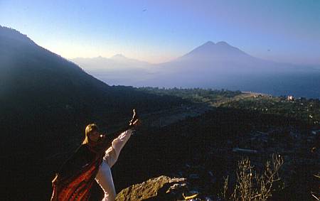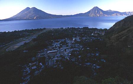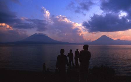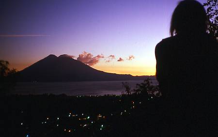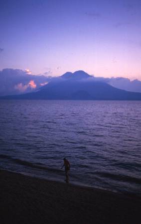Dawn on Lake Atitlan, elevation 5100'. I lived and worked here in the village of Panajachel. The 3 volcanoes are Atitlan, back left, at 12,500', Toliman in front, 11,500', and San Pedro, right, at 10,500'. In front of the twins at left is the smaller Cerro de Oro.