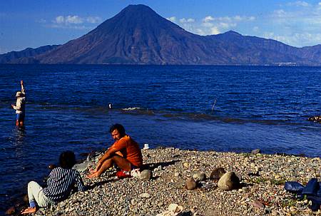 Where the Rio Panajachel enters Lake Atitlan at the public beach. Volcan San Pedro.