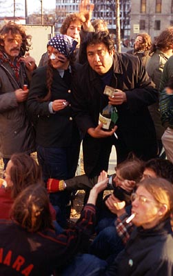 Indian caught in the act of collecting money for more wine, near the huge protest of Nixon's 1973 Inauguration, Washington, DC. He told the DC mounted police "give me back my horses!"