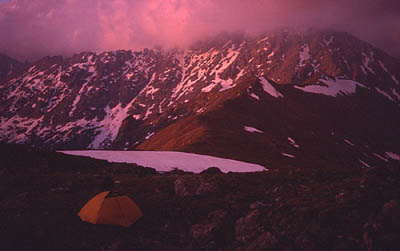 The highest place I've ever camped, about 13,400' at the low point in the ridge from Gray's Peak 14,247' to Edwards Peak 13,850' right off I-70 West of Denver. Lots of mountain goats on this ridge on the Continental Divide Trail