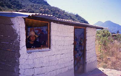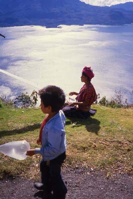 A plastic bag is a balloon to poor kids in Guatemala. But Mom gets to do her weaving here at one of the best overlooks, some 2000 feet above Lake Atitlan.