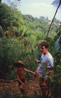 Raul Vasquez Barrios, now Guatemala's most successful modern artist, Lake Atitlan volcanoes behind.