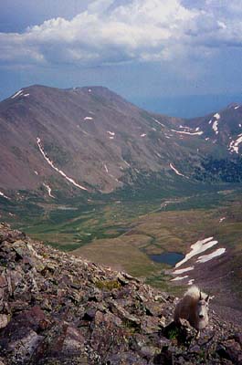 Mountain goat grazing on Gray's Peak, Horseshoe Park below. On the Continental Divide, CO