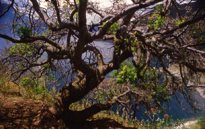 Returning from the Cave of the Witches (in the volcanic pillar). The towns of San Pedro (left of pillar) and San Juan (right of pillar) on Lake Atitlan